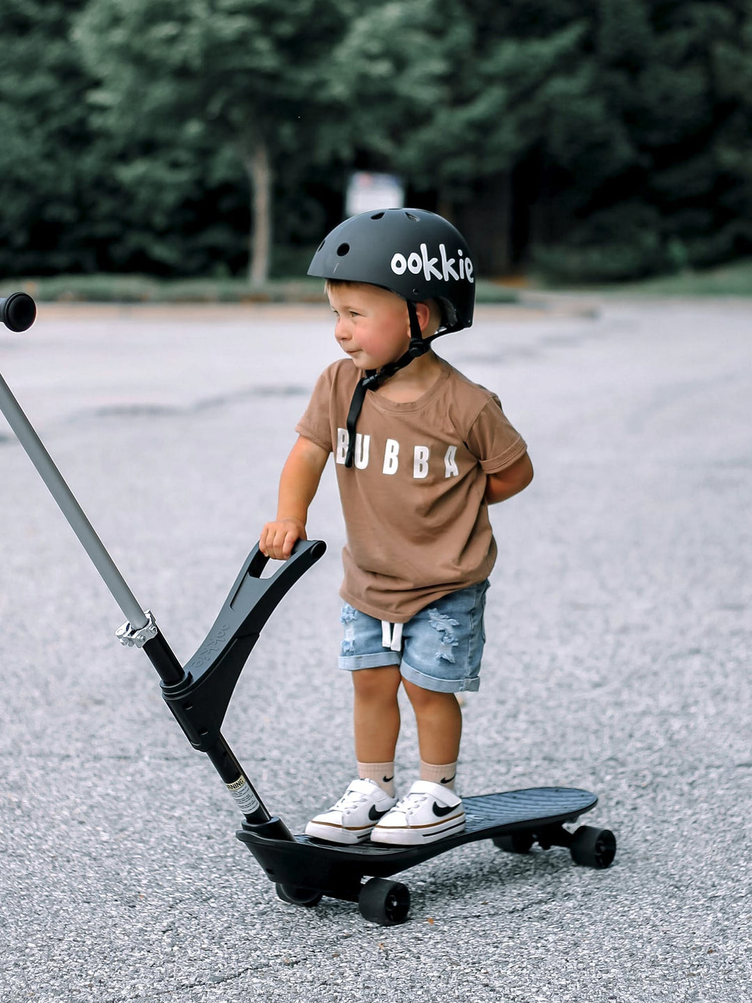 We got the Ookkie for Haydn (2.5yrs old) to learn balance, to bring some fun to our normal walks, so he felt like his siblings on their skateboards. Ookkie is fun for the whole family, each of his older siblings love having their turn to push him on it, it makes our walks more fun and makes him feel so special!